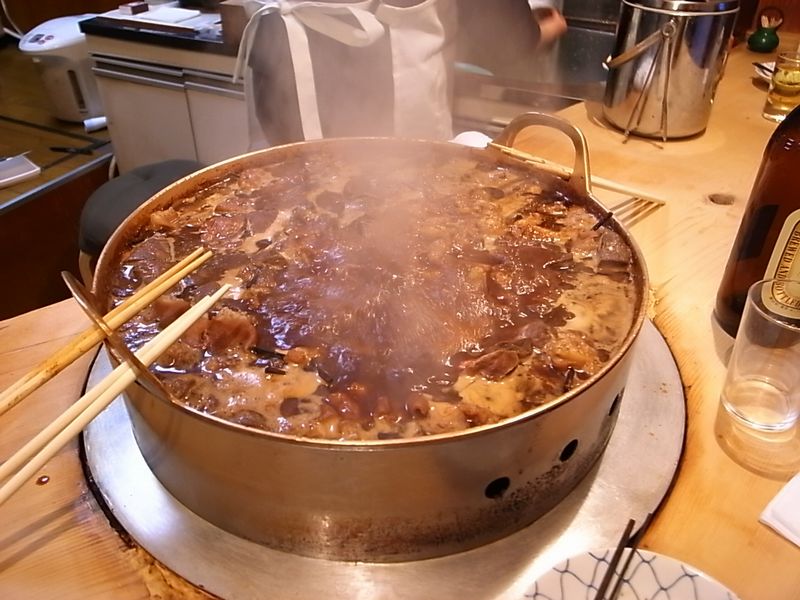 磨きぬかれた白木のカウンターにくつくつと大鍋が掛かる、 とてもきれいな空間は<きたないモツ煮屋>の想像を嬉しく裏切ってくれました。
