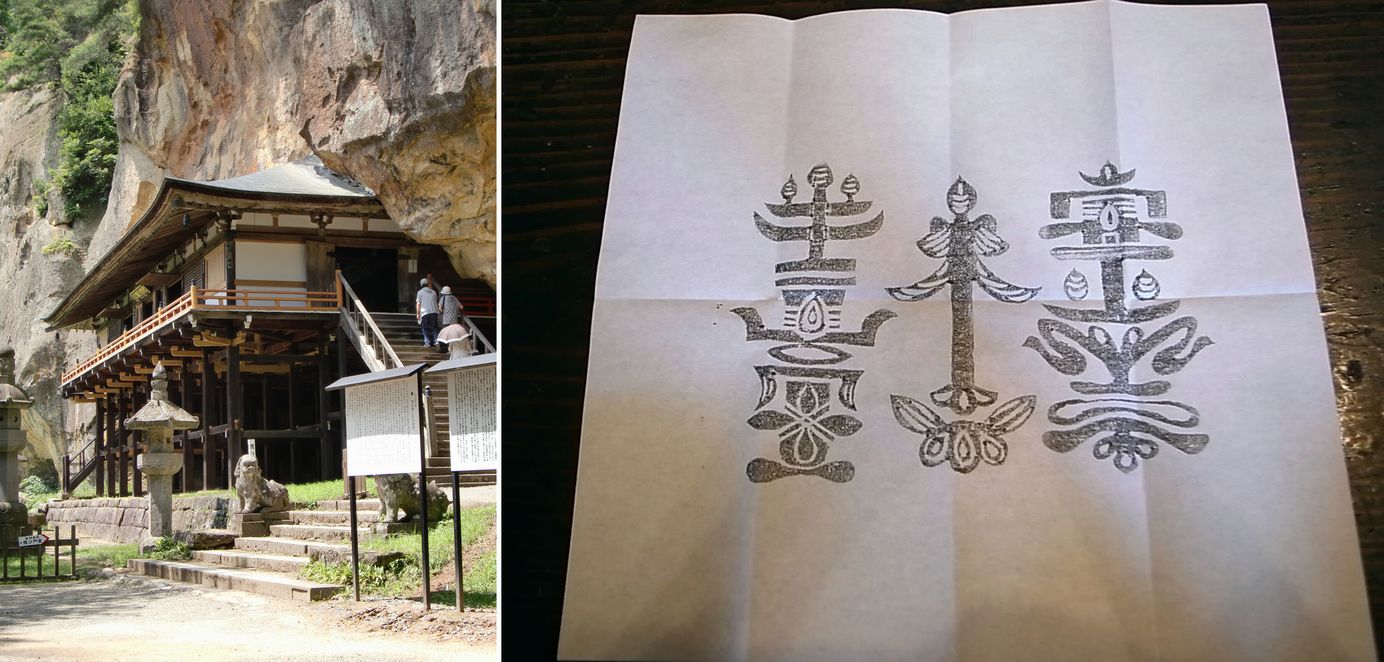 厳美渓から平泉に向かう途中の達谷窟。 その毘沙門堂で配られる牛玉宝印は毛越寺で出だしている牛玉札と同系統。 正月以外でも頒けていただけるとのことで、喜んでいただいてきました。 大きさとすると中版くらいのサイズ。 ただ、字が読めません。今は別当の達谷西光寺から出されていますが 西光寺とも読めませんし…。達谷牛玉宝印なのでしょうか?