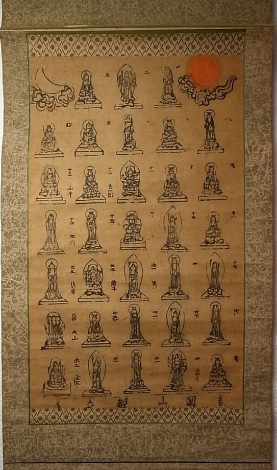 目につけば仕入れているうちに数も溜まってきますと(残念ながらあまり売れ行きは良くないのです) なんだかいっぱしのコレクターのようにもなってきまして、そこでこの観音札所巡礼絵図。 巻止めには「出羽三山」とあり、観音像の下の、常ならば山号や寺名が書かれるところには山寺や大山、馬などという字もみえます。 東北で出ましたが、初見のモノ。 今まで観た中でも三本の指に入ろうかという巡礼絵札。
