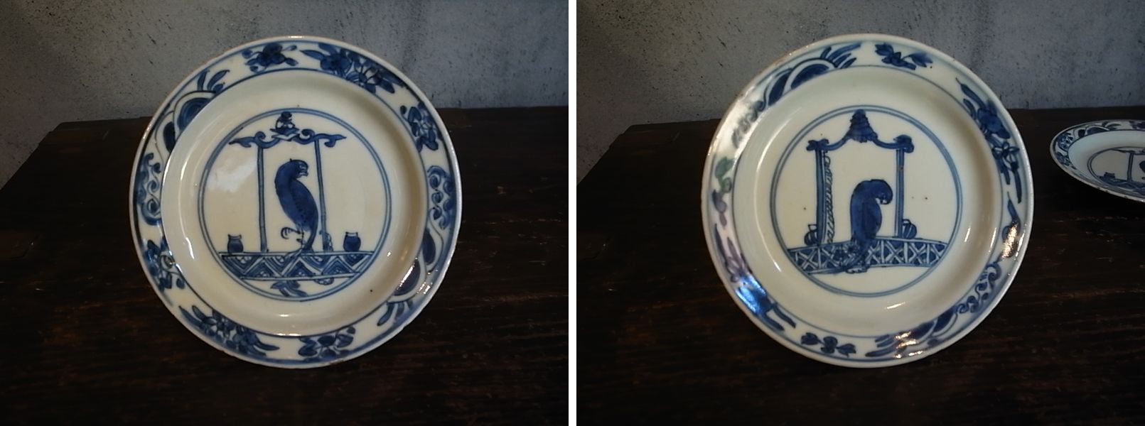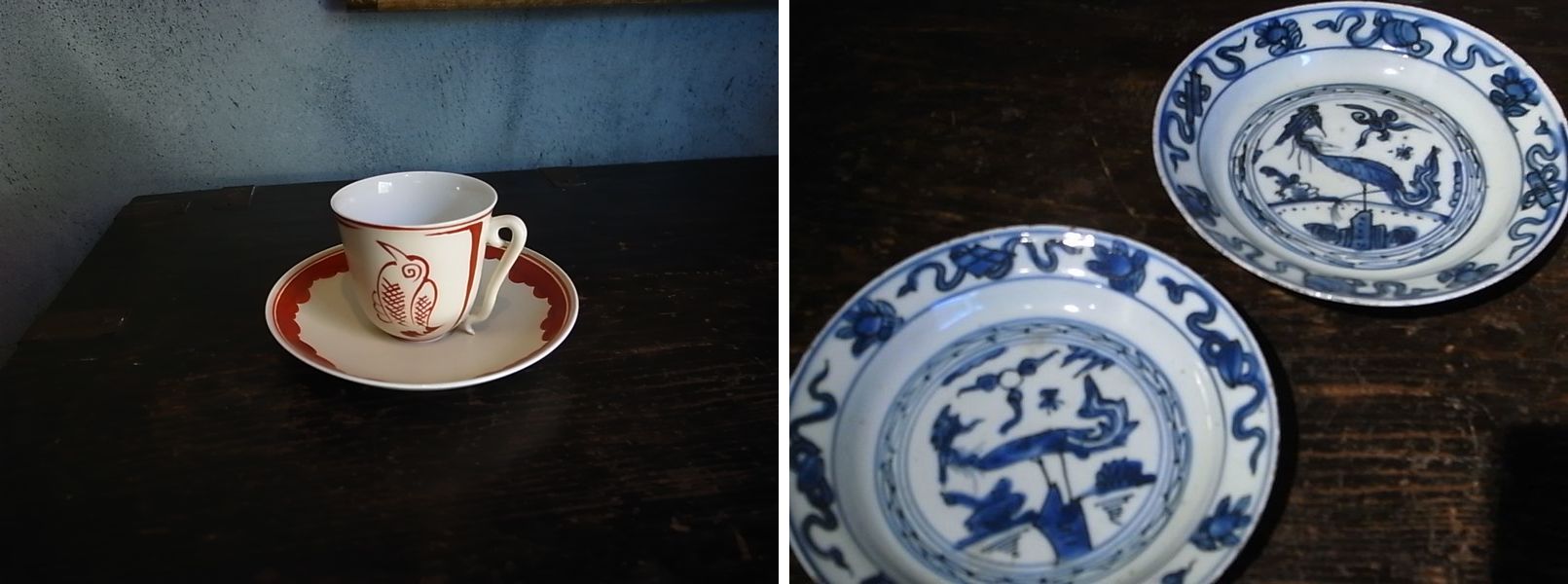 鳥の絵のコーヒーカップは戦前の佐賀県窯業試験場の作品。