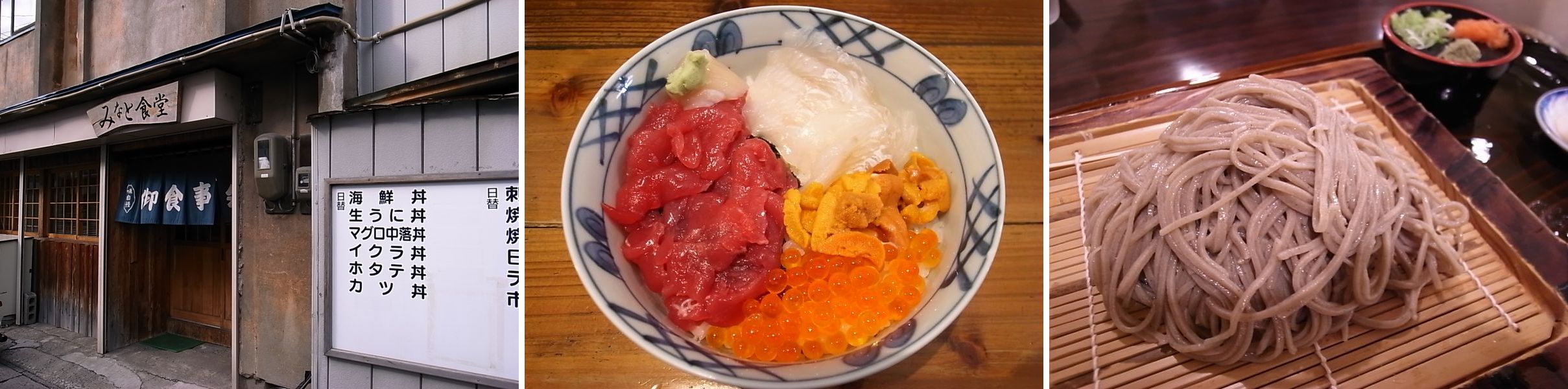 感激したあとは市場探索。 朝市で有名な陸奥湊まで。 昼時だったのでもう市場の活気は消えてしまっていましたが…。 車で流しながら見つけたこの店、<みなと食堂>。