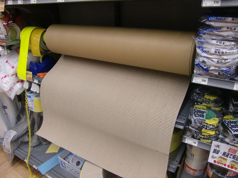 みると二箇所で山積みに。 イ草は支援グッズではポピュラーなモノなのか? 値段はなんと一枚500円を切っていました。 さすが、ビバ・ホーム! 切りのいいところ20本ばかりを買い、こんどは梱包コーナーへ。 ここにはロール・ダンボールも計り売りしているのですね。 20本まとめると4畳半用のカーペットくらいの太さ。 計ると1メートル30センチ。