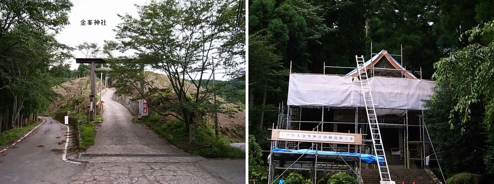 そのままぐんぐん上り、こんどは一番奥の〔金峯神社〕。 参道両脇の杉が丸坊主にされていた。 本殿も工事中。覆いがかけられ残念! ここで道長の経筒が見つかったと。 元禄四年のことだそうで…。