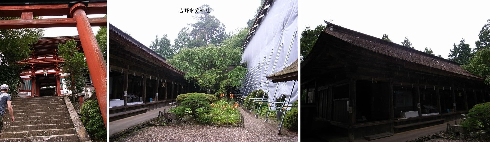 戻りながら一番行きたかった、〔吉野水分(みくまり)神社〕へ。 残念ながら、ここもシートがかかり工事中。 中央春日造り、左右流れ造りとされる三殿の社殿も見たかった。くぅ。