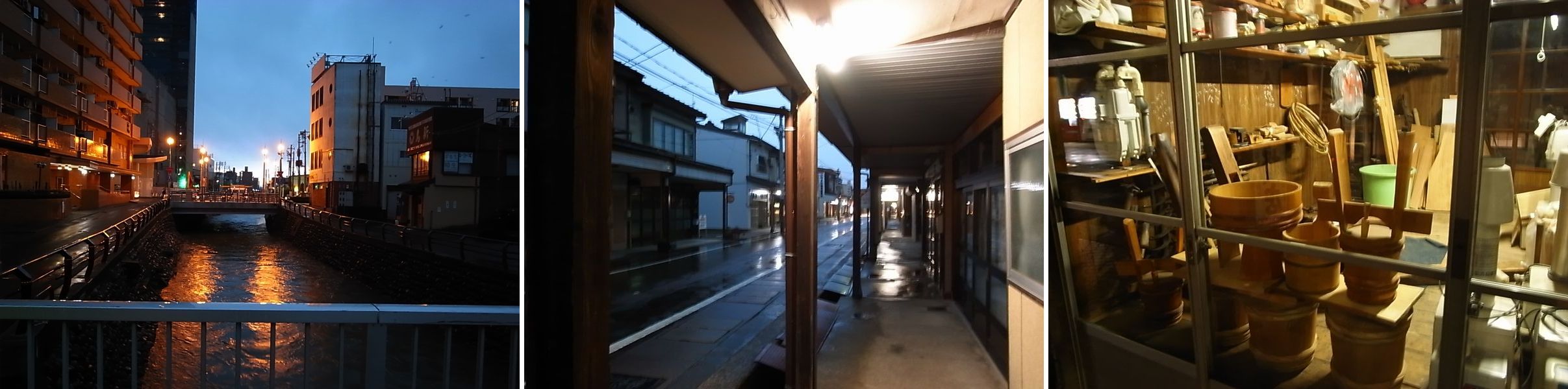 さて、高田では街中を流れる儀明川もいい塩梅に暮れなずみ、 いよいよ<仲町>に出陣です。 懐かしい雁木、桶屋さんも残っていました。
