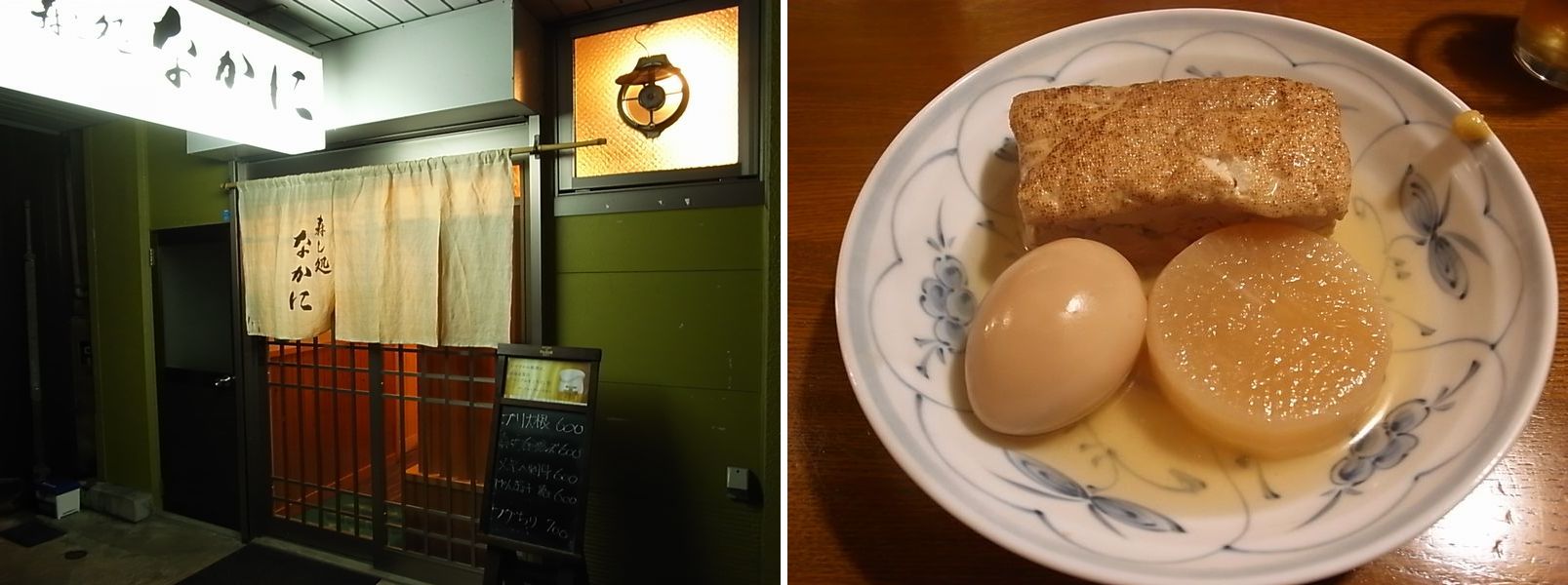 呑み屋街を散策するのは私の楽しみ。(この日は独りという事もあり、店を決めるのに一時間以上も…) ぶらぶら歩きながら旨そうな寿司屋とカウンター割烹の店とで心揺れ動きます。 ここは寿司かな、と心を決めてお邪魔するもっ! 予約でいっぱい…。 がっくりして隣りのおでん屋へ。 ビール一杯で出るつもりが、ざっかけない店内に妙になじんでしまい。 日本海の鱈、メギス、ゲンゲなどですっかり出来上がってしまいました。