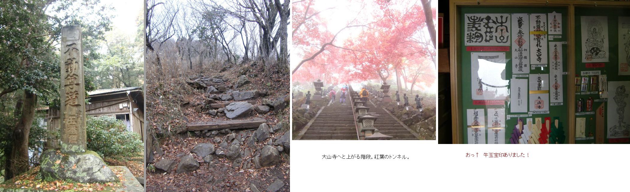 ケーブルカーもあります。が、当然徒歩で。 女坂をのぼり中腹、大山寺でお不動様に手を合わせ、牛玉宝印を発見。 さらに阿夫利神社下社へ。名物もみじ汁をいただき、 <納めの木太刀>も見て、上へと目指します。