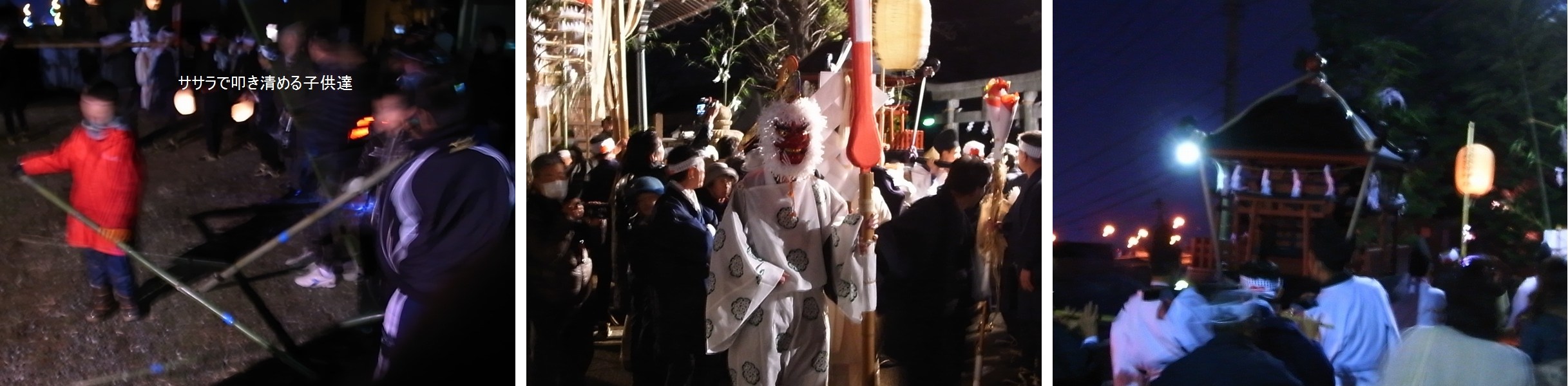 子供たちがササラで道を叩き清め、天狗がでてきて神輿を先導します。 神輿は近くの浅間神社まで渡御するのです。