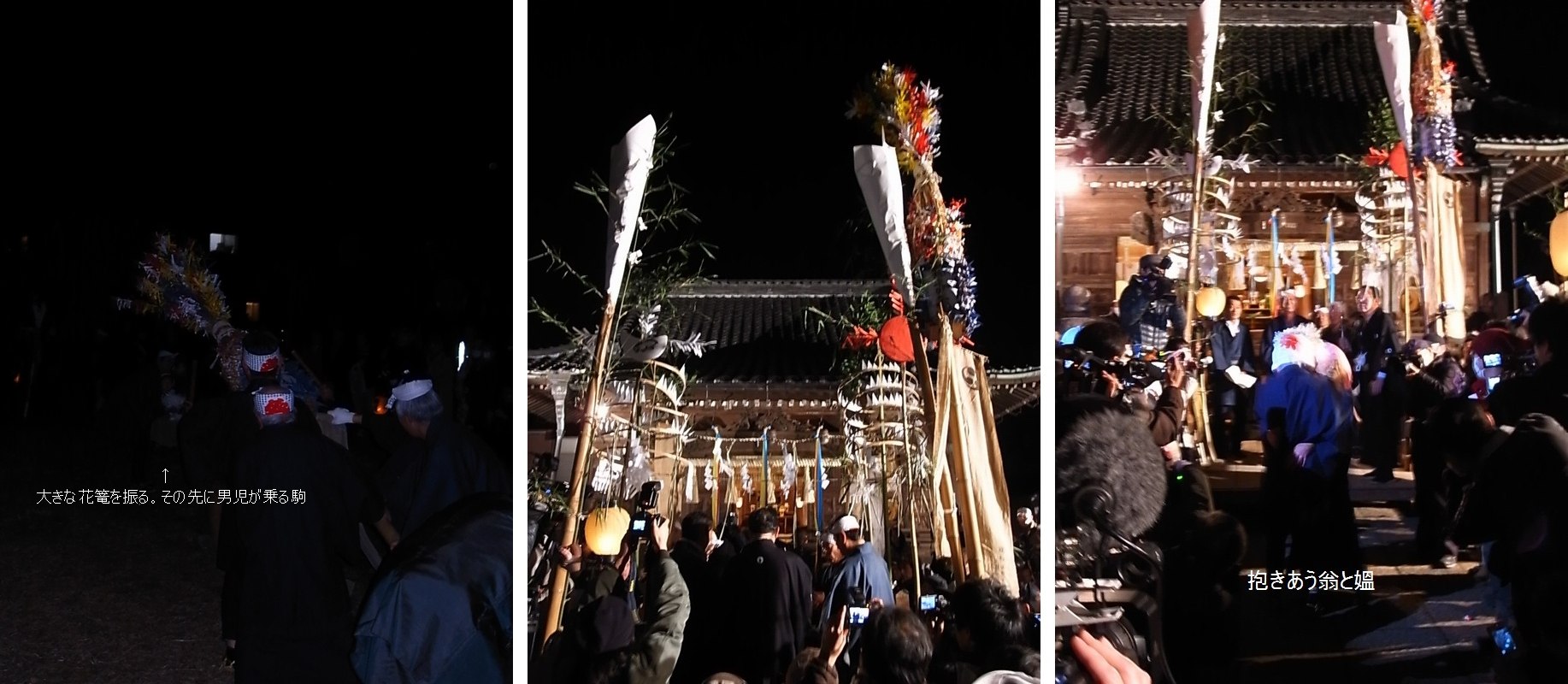 諏訪社境内では三の鳥居から<よぼね>が登場し、 翁と媼(太郎次とやすめ)が舞いながら抱きあい、きわどい動作を繰り返します。 そして大稲本が白扇と錫杖を持ち、結界をきった<もがり>のなかで田遊び=鎮魂が始まるのです。