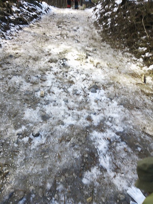 しかし、雪こそちょっとしかなかったですが、急な斜面はガチガチのアイスバーン。 行き交う人はみなアイゼン履いた完全装備。 「登り一時間くらい」ということで普通の登山靴で気軽に来たので、完全アウト。 二・三百メートル登ったところで断念。へっぴり腰で下山しました。