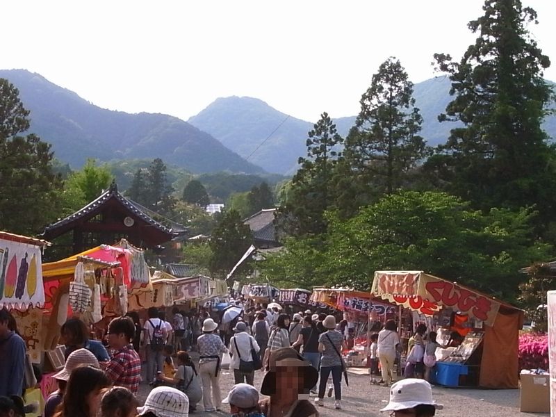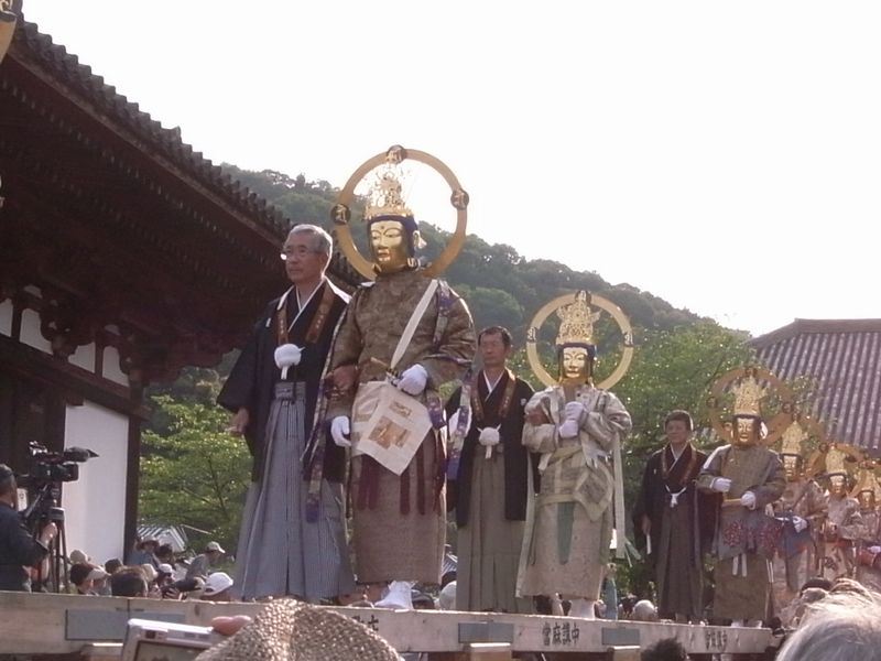 毎年5月の14日に執り行われる、当麻寺の練供養会式。 この日も二上山に夕日がかかる、午後4時あたりから、 本堂と娑婆堂間に架けられた橋の上を僧たちがゆっくり進んでゆく。