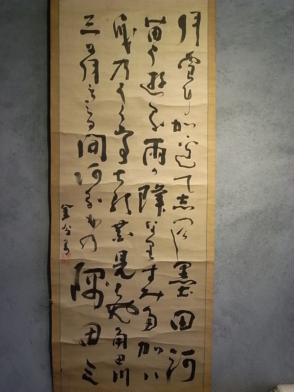 先日面白そうな句が書いてあるので仕入れた一幅ですが、 金令舎、とあり、白雄の高弟鈴木道彦の墨田川四句でありました。