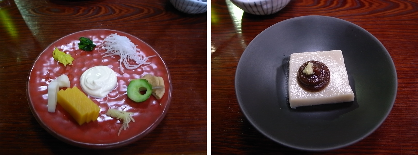 画像は膾・白和えです。皿上のものを全部混ぜ食します。これは美味しい。 胡麻豆腐は普通かな。 許せないのは湯豆腐をポン酢で食えと云ってきたこと。 鍋物の豆腐はポン酢で食べることはありますが、湯豆腐は無いでしょう。 場末の居酒屋じゃないんだから。 場末の居酒屋は許せますね。 あのステンレスの小鍋に白菜の切れっぱしと共に入ったやつ。 たまには湯豆腐と云いながら鱈のカケラも入っていたりして。 冷凍の鱈の身。ぐずぐずで味も何にもしないやつ。 あれは逆にポン酢でないと食べられないかもしれない。 あれはいいんです、あれは。 でも豆腐専門店じゃどうなんですか? 豆腐の味が分からないでしょうに。 代わりの生醤油をもってこさせ、 絶対こっちの方がうまいぞ、なぞと大はしゃぎ。 …反省してます。