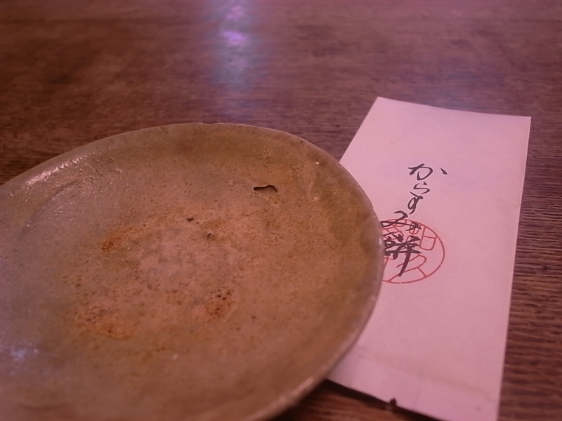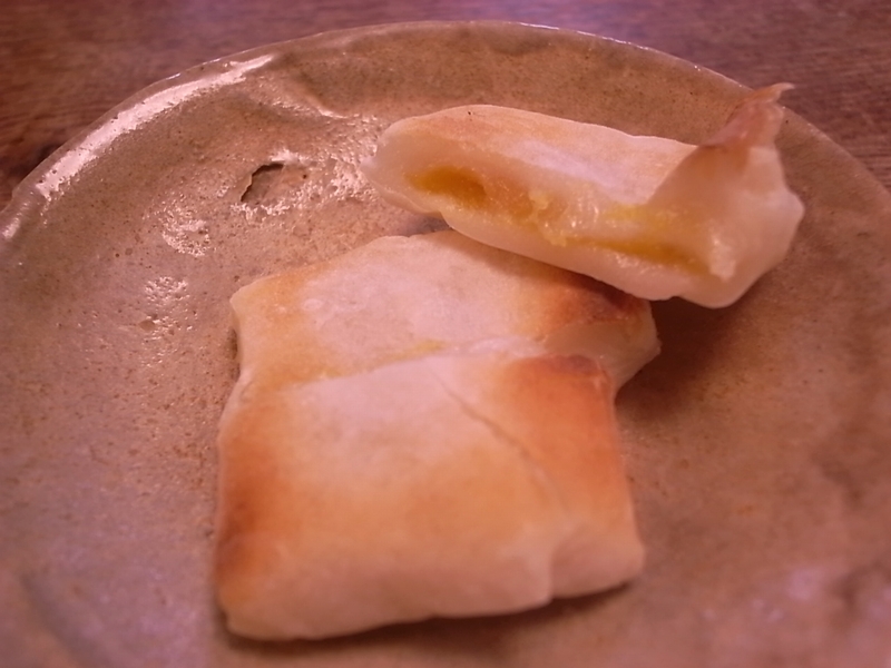 和久傳の<からすみ餅>。 かるく炙って下さい、と説明書きにあったので ホントに軽く炙っただけで食してみると、中からはとろりと温かいからすみが溢れてきて…。 かなりの完成度。