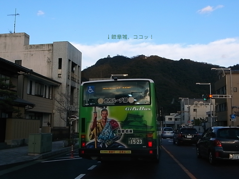 市内はゲームのキャラなのかイケメンの戦国武将がバスにラッピングされていました。 ちょうど岐阜城と信長が〜