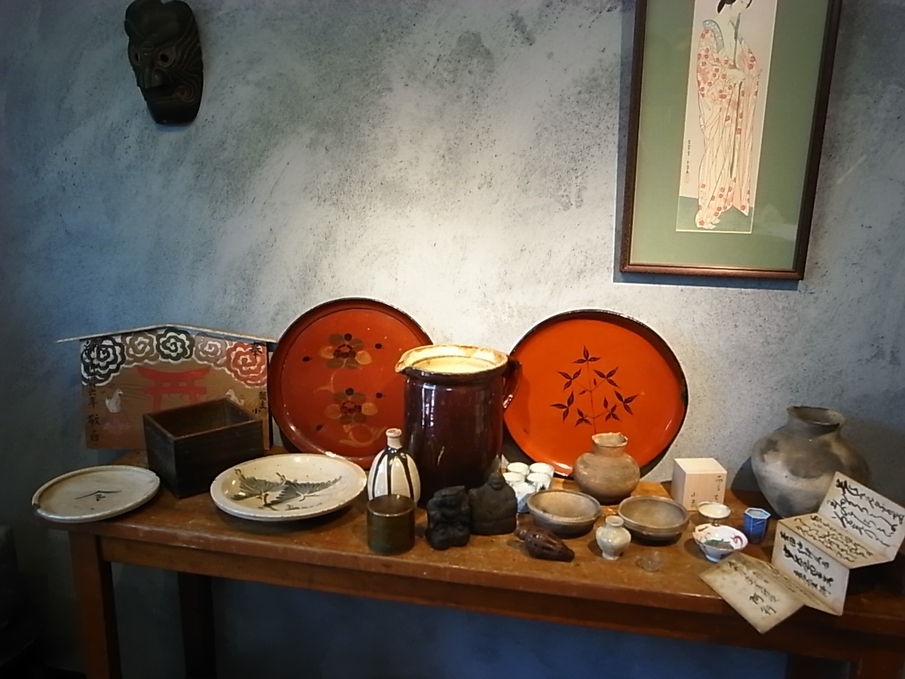 その前に民間仏。かなり珍しい三面大黒さんと布袋さま。 白丹波の流釉徳利と開化堂の銅茶缶。 これも珍品竹細工の虫篭。 うしろに南天と椿の漆絵盆二枚。 かわいい松文の伊万里のぞき五客。 左手に秋田からのお稲荷さんの絵馬。 枡には松茸とかたつむりが彫られ。 石皿と行燈皿。この二枚もめずらしい図柄です。 縄文の小品はどれも優品揃い。 いつもなら半年に一点くらいしか買えないものが三点も。 古瀬戸の灰釉小壺。そのとなりに雛道具のガラス盃。 めでた盃と変わり種ふたつ。 亀ヶ岡の壺に天保年間の富士講資料。 壁に大好きな五葉。 机の下には鉄鉢。