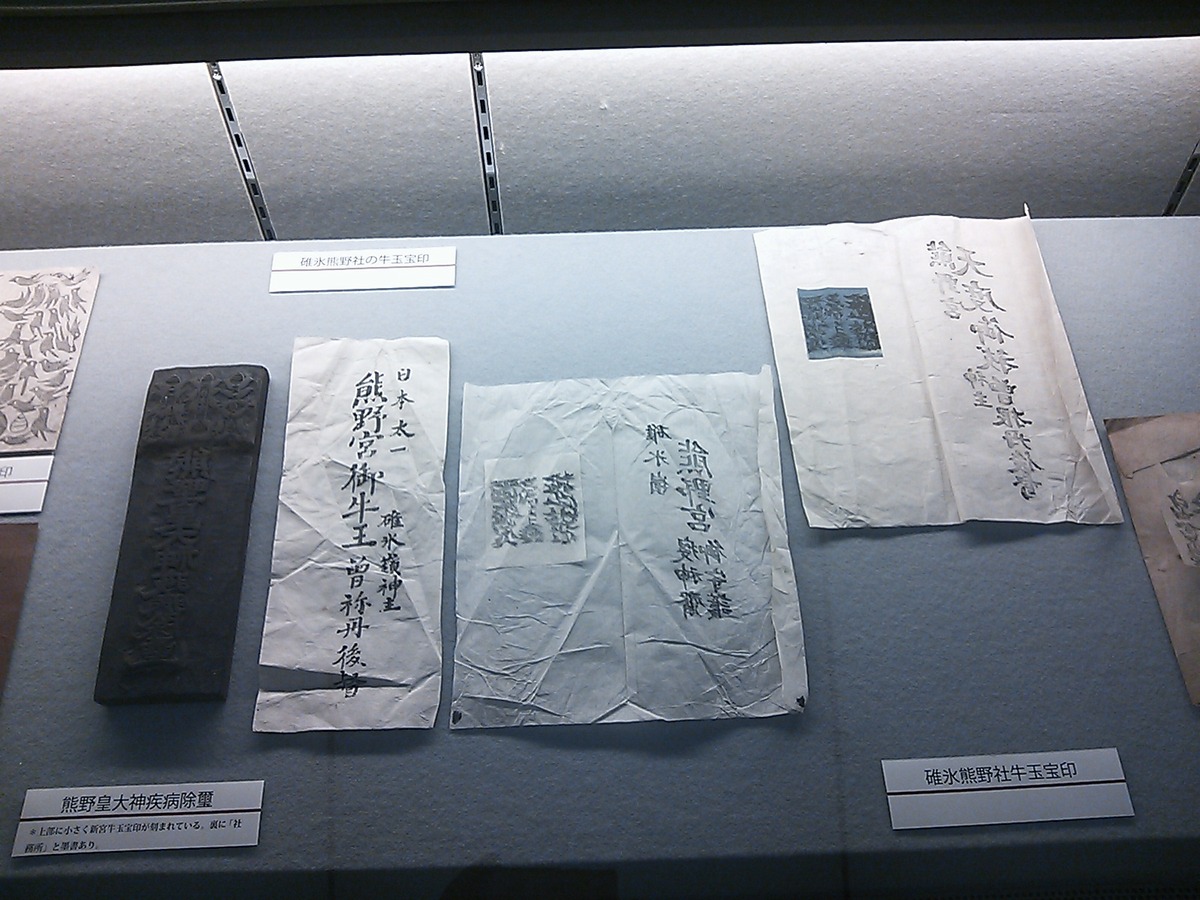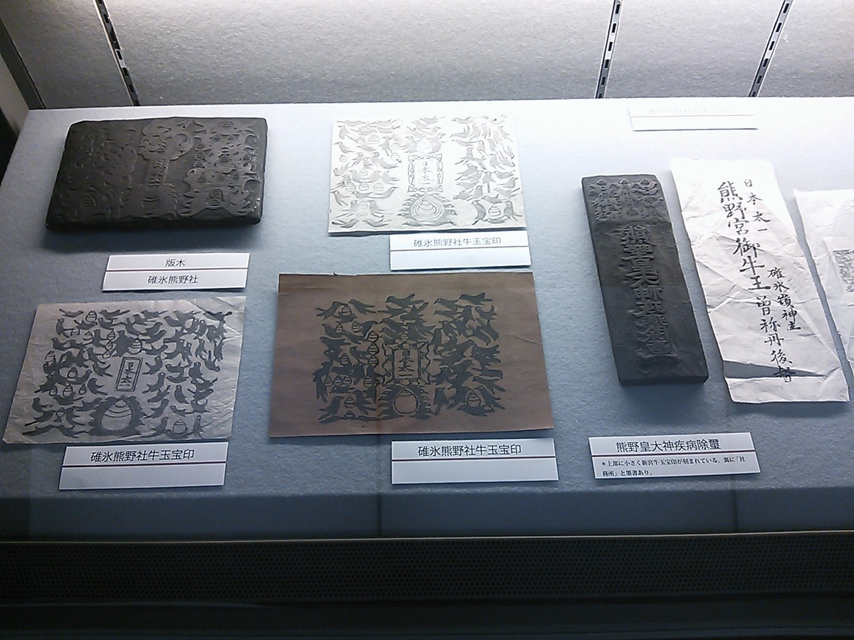 今回は碓氷の熊野社から出ている、いわゆる<日本太一>の熊野牛玉、それの変わりバージョンを幾つか展示してきました。 本家紀州の熊野社と今でいう版権問題で争い、負けた碓氷の熊野社は那智瀧宝印の真ん中に入る<日本第一>の文字を<日本太一>に変更を余儀なくされます。 その文字を際立たせるためか、額状に囲みが入るものがあるのですね。