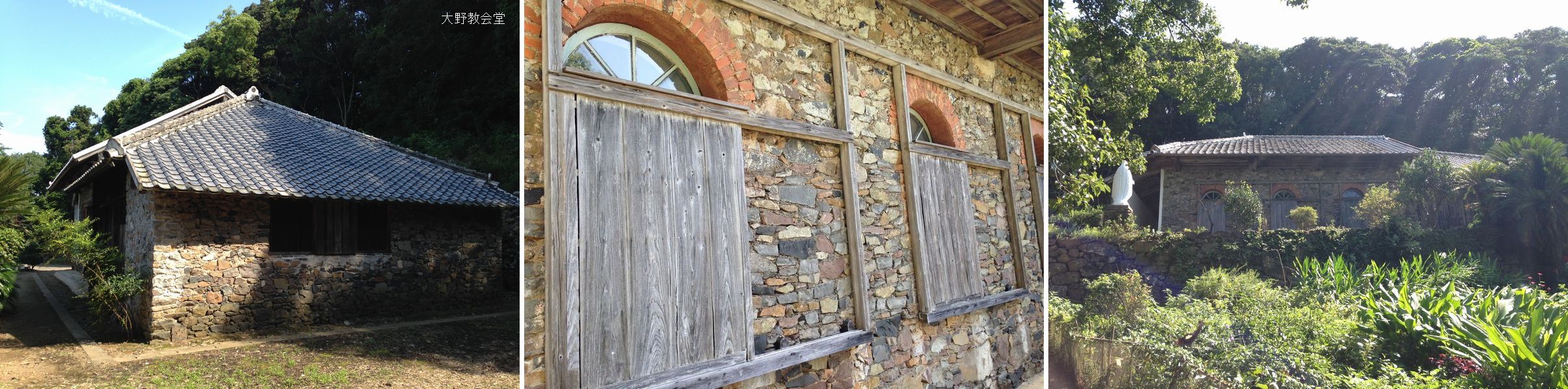 B大野教会堂 独特な壁。これにもド・ロ神父の名が冠されている。明治26年に設計した巡回教会。重文でも、ある。