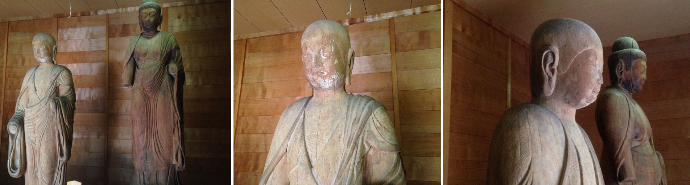 重文指定用のこのコンクリの所蔵庫には藤原の仏像も一緒に安置されていたのだが、 皆、目もくれず。(罰当たり!) この一木造りの大きな三体に釘づけられていた。