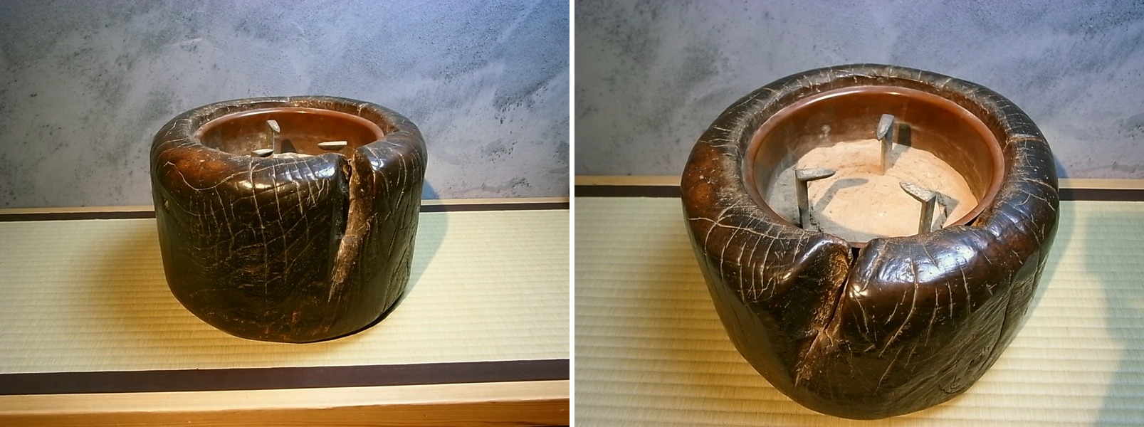 数寄好みのお客様の処には、だいたい洒落た手焙りとか小振りな火鉢とかがある。 なかには、琳派風のうさぎや月などが象嵌されているものもあったりする。 それはそれで整っているのだが、天邪鬼だからどこか、(出来過ぎているなぁ) との感が抜けきれずにいた。 もう少しゴリッとした、無骨で洒落たものはないかなとずっと探していたところ…