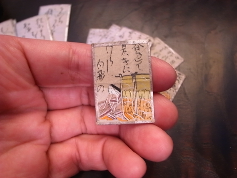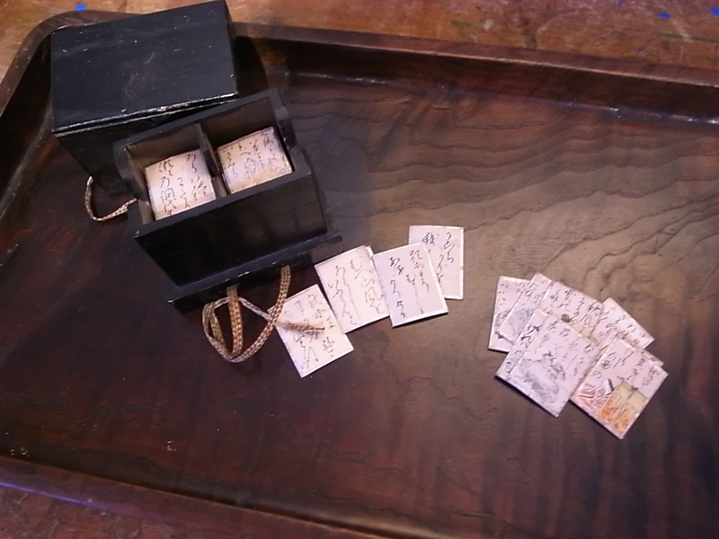 昔から、見ると買ってしまうこのミニチュアカルタ。 京の古玩店でみつけたのだ。 裂や紙のタトウ(畳紙)が多いのだけれど、これは珍しく小さな木箱入り。