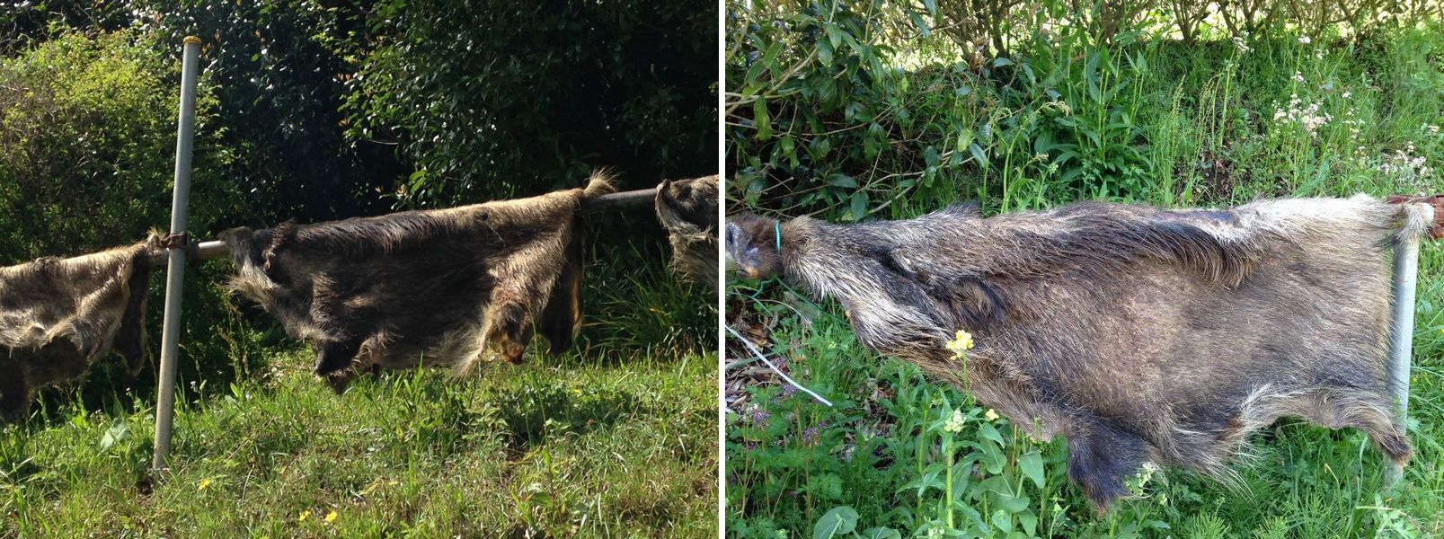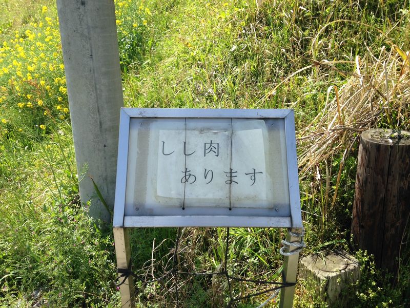 秦野中井インターから結構入った山の中。 街道の脇に設けられた鉄パイプの柵。その上になにやら毛皮が何枚も干してある。 状況の異様さに車から降りてみると結構な獣臭さ。ハエもぶんぶん呻ってる。 傍らの看板<しし肉あります> 常に泊まる箱根の寮でも猪が筍を食べに来て困ると聞いていたが…、 ここは猟師さんの家なんでしょうね、猟犬も繋がれていました。