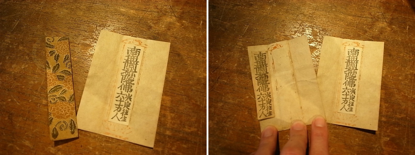 右は更に上等。 外包もつき、勢至と観音の両菩薩までもが摺られている。