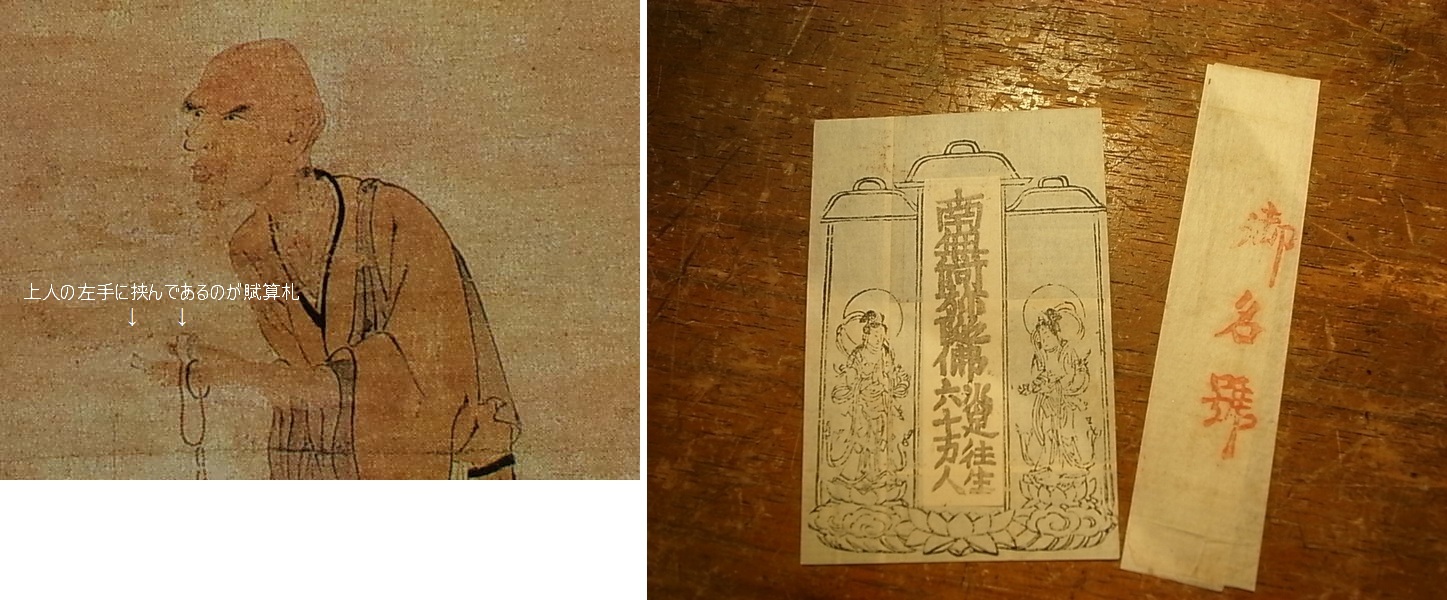 時宗の一遍上人が配っていたのはこの賦算(ふさん)札。 「南無阿彌陀仏 決定往生六十万人」 上人の時代から「すでに形木を使って摺った札が配られていたという〜」ことらしい。(東京美術『時衆の美術と文芸』)