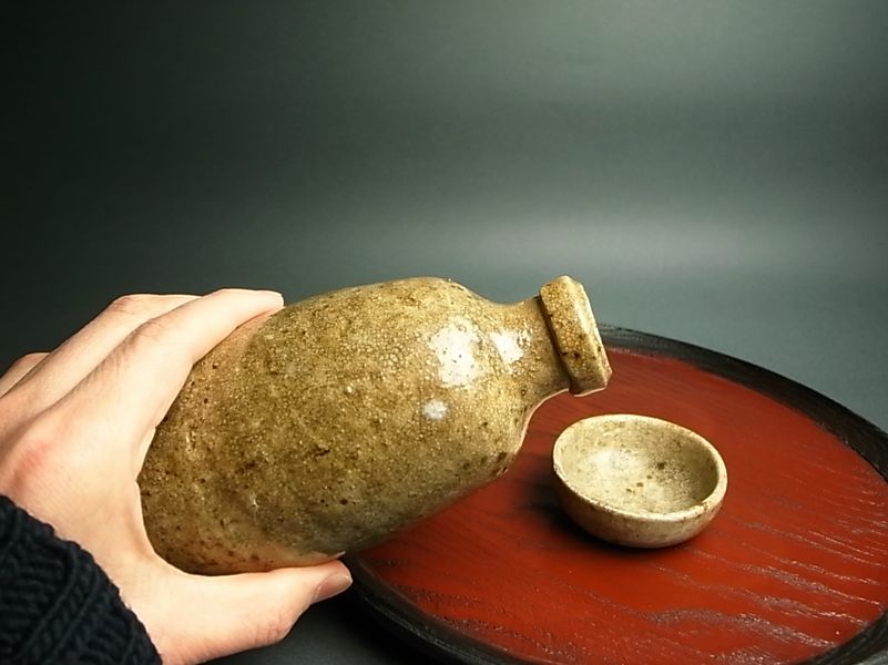 月例の交換会でこれを見たときは、瀬戸の貧乏徳利か、と洟もひっかけない素振りだったと思います。 ところが傍らにある盃と、この二つが一緒に入れられるよう誂えた桐箱を見た時、何と言いましょうか、旧蔵者の執念というか、 下手な安物の瀬戸徳利ではあるがその最上のものを探すのだ、そして何かを(その何かは分かりません。権力や社会だったり実際の人物だったり) 見返してやるのだ!というような、繰り返しますが<執念>とでも呼ぶべきものを「ゾゾゾー」と感じ取ってしまったのでした。