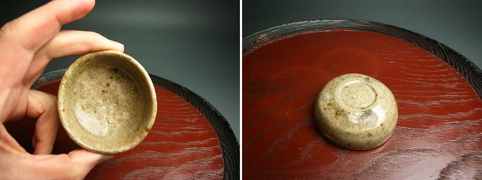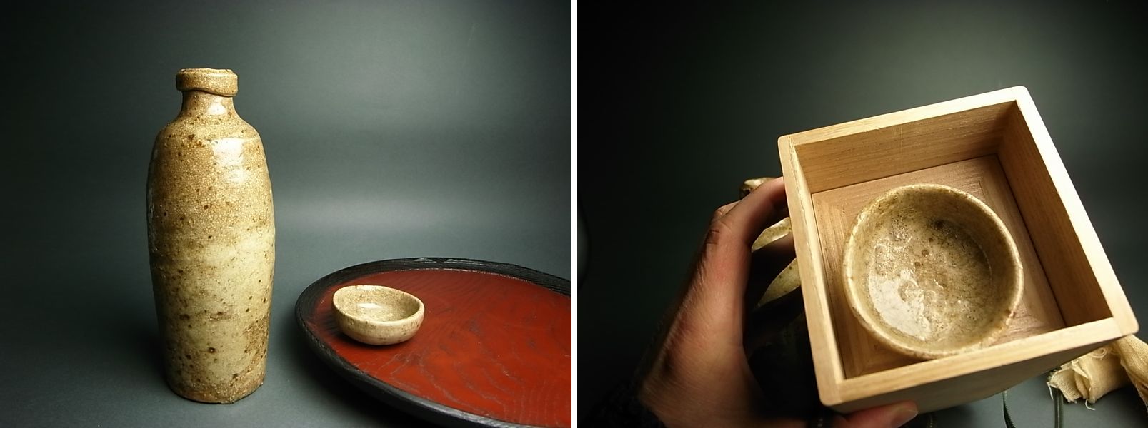 仔細に見れば無いものです。 灰釉は驚くほどつややかで高台は土見せ。 ピンホールからは鉄分がでて鉄斑文になっています。 練上げ状に胎土も右上がりに積まれ、容量酒呑みにピタリ、二合五酌。 盃のほうも轆轤整形のあとピントチに乗せ高台内まで釉を掛けています。 雑器とは思えない作りよう。