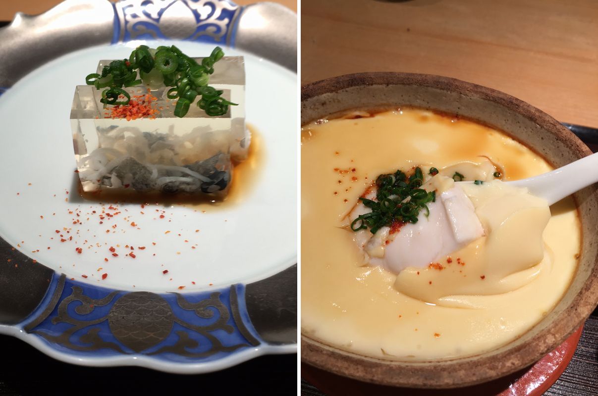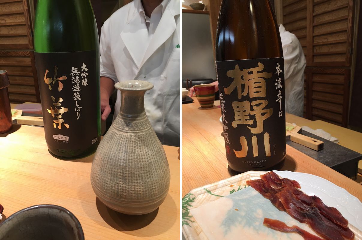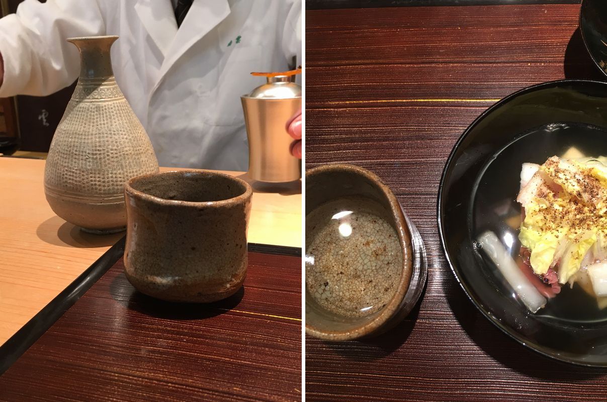 冬の醍醐味とはいえ、河豚の煮こごりに白子の茶碗蒸し、反則です。 ヨモギのすり流しに唐墨だとか、こちらの好みを知り抜いて酒が進むものばかりを出してきます。 大ぶりな盃ですので、どんどん進んでしまいました。 店の親方やら他のお客様にふるまったにしても、二人で一升瓶二本はやはり…。