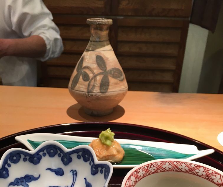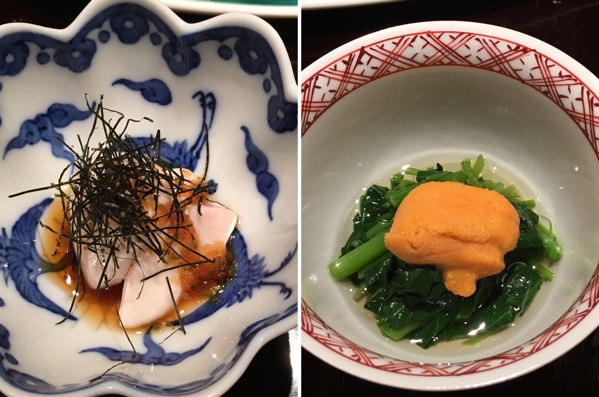 鯛の白子をポン酢で。 雲丹の下はモロヘイヤ。 なんとスッポンまで。