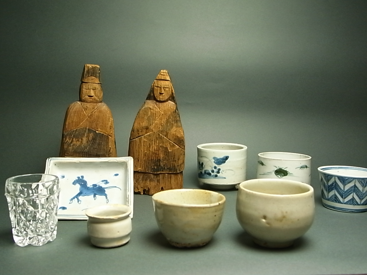 小さい古染の角皿はfufufuに出します。 ちょっと面白い神像に、 伊万里は草花文の香炉、生掛けでいい感じ。小ホツあり。 突進してくる雀の筒盃。これは面白いんじゃないですかね、ニュウがあるんですけど。 矢羽根文は丈が低いのが見所。口にノミホツ、高台にホツ。 小さいゲンコツのプレスコップ、これまた小さいデルフトのクリーム入れに李朝堅手がふたつ。(売約済)