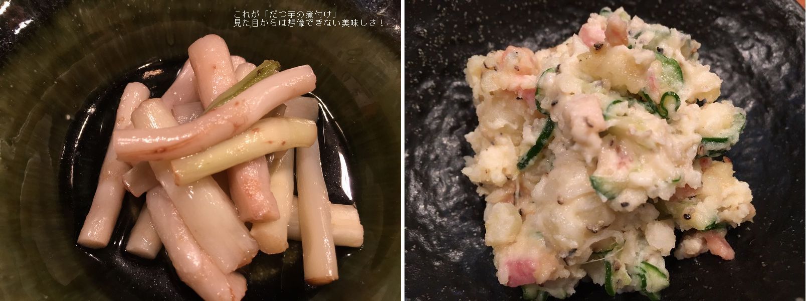 まずは「だつ芋の煮付け」 だつ芋とはサトイモの芽の部分で、このあたりでは(名古屋ではという意味だろうか?)昔から食べられていた郷土食なんだそう。 さっぱりした味付けに独特の食感。これは美味しかったですね、またこの時期に食べにゆきたい。 定番ポテサラ。 串カツは味噌とソースと半々で出してくれたり、こないだ食べて感激したチーズオムレツ・ゴルゴンゾーラソースをまた頼んだりと、楽しい時間でした。 いつもは飲むばかりで食べないわたくしなのですが、ここで<食べるスイッチ>が入ってしまいます。