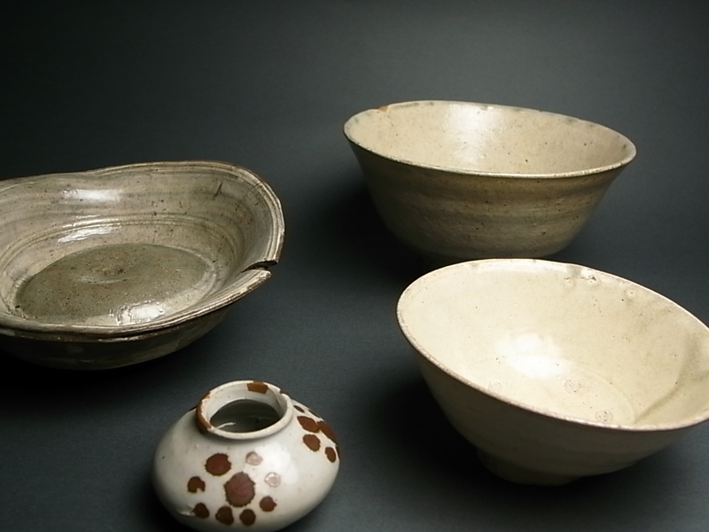 つづいて朝鮮陶チーム 鶏龍山の浅鉢(二枚が窯内で溶着)無疵の無地刷毛鉢。 色白さんの鉄砂小壺。ころ合寸法の粉引茶碗。