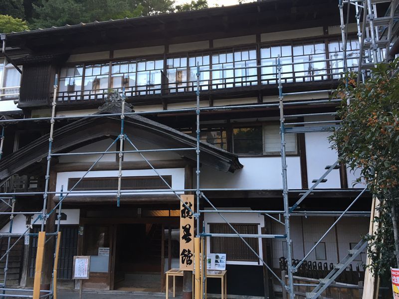 今回その中でも、建物のすごさで<積善館>さんに宿泊したのでした。 千と千尋のモデルと言われる前新という建物には大正ロマネスク様式の風呂があり(画像)国の登録文化財です。 元禄年間に建てられたと言われている(どうもそうは見えないが)本館は群馬県の重要文化財。 ちょうど今は八十年ごとに行われるこけら屋根の葺替え中ということで鉄骨が組んであったのがちょっと残念でしたね、絵的に。