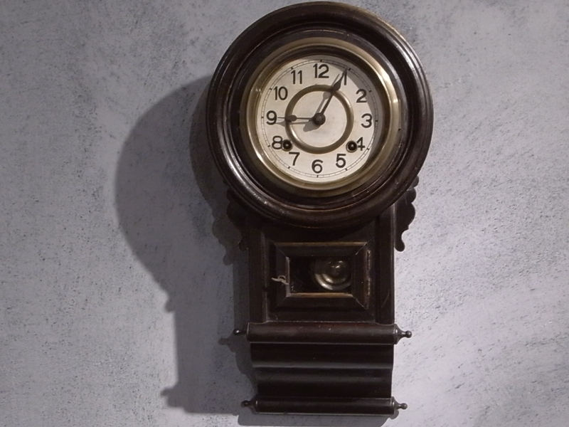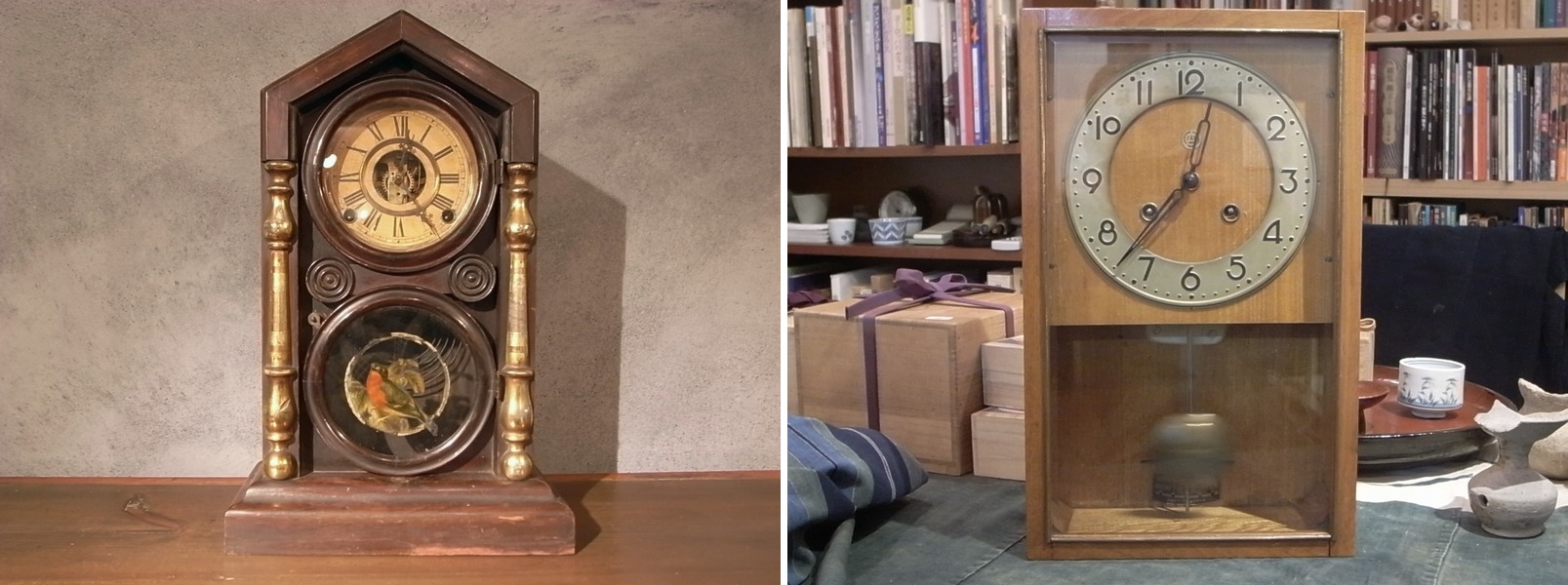1955年頃のアイチ時計、すっきりしたデザイン。 イングラハムの珍しい置き時計。1800年代 明治末から大正初めころかと思われるSEIKO初期の壁掛け時計。