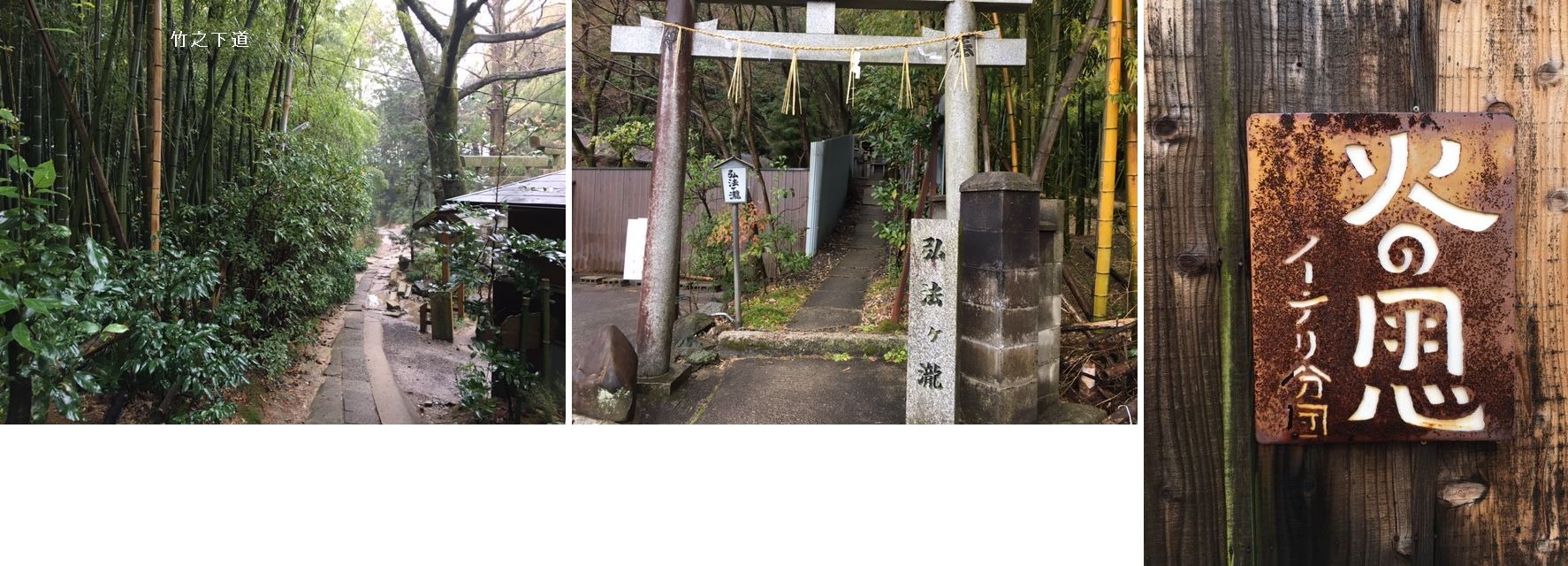 この神寶神社、本殿・神明宮の裏手に井戸もあり、狛犬の代わりに龍、水神を祀ったりと非常に水と近いお社。 これより参道に戻らず、山中<竹之下道>をとおり、弘法の瀧、青木の瀧、山を下り、命婦の瀧、八島の瀧など<お滝場>を巡ると、 鳥居をくぐっているだけでは分からない稲荷山と水との高い親和性が見て取れます。 裏道で見つけたブリキの切り抜き看板「火の用心 イナリ分団」もなんとなく意味深。