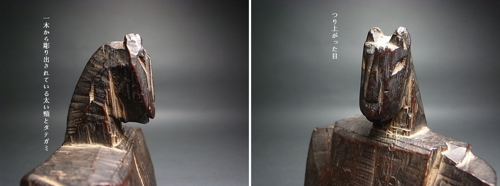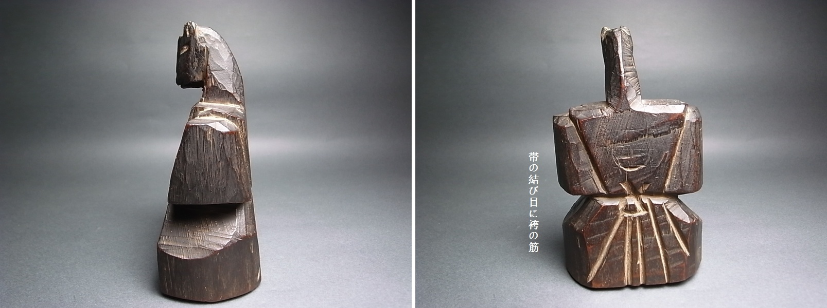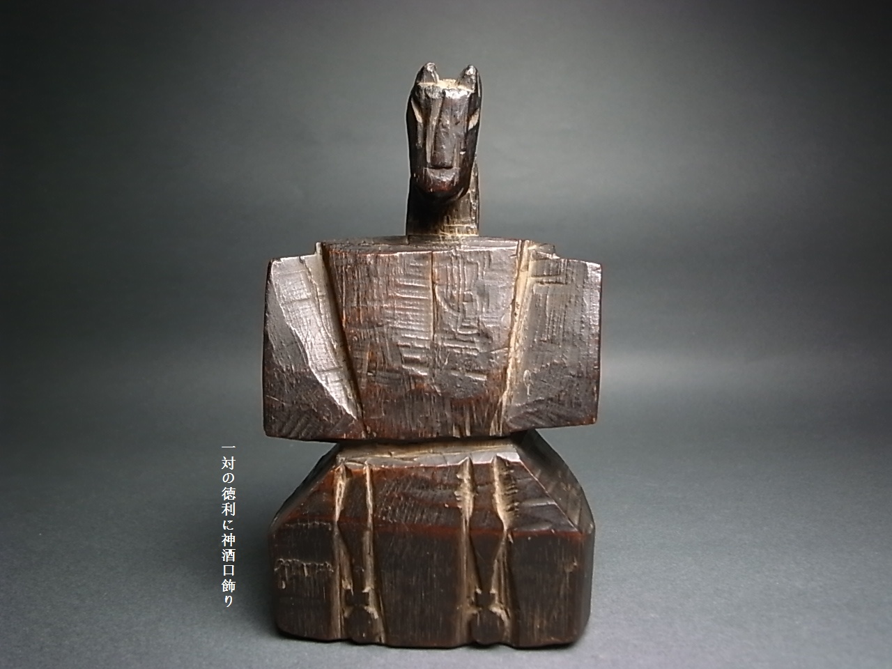 蒼前様のように馬に乗った御神体でなく、馬自身が束帯姿で神の形をとっている。 加えて、膝前の彫りは徳利に神酒口飾りが挿してある、しかも一対。 (ということは、この馬頭神がこれ単体で祭られたことを示す) 今まで見たことのない、馬ノ神のお姿。