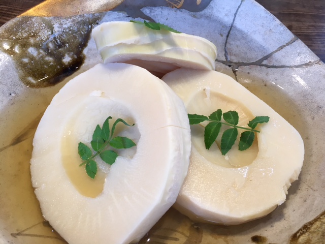 まずはつめたく冷やして刺身のように。 木の芽を和えた酢味噌でいただきます。根の部分、直径15センチ強! 大きいんです、驚きます。そして柔らかい。又驚き。