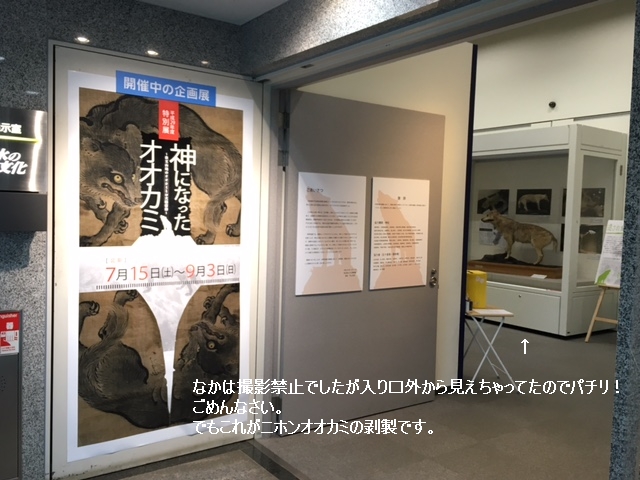九月の三日まで、埼玉県寄居町の「埼玉県立川の博物館」で標記のオオカミに関する展示会が開かれています。 雨もよいの日曜日、神社の骨董市の帰りに関越道をブッ飛ばしてきました。
