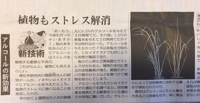 イネやシロイヌナズナにアルコールを与えたところ、塩害のストレスに強くなる事を発見したのだとか。 「飲酒」後のDNAを調べてみると、ストレスによって生まれた悪玉の活性酸素を無害化する酵素をつくる遺伝子が活発に働いていた。 つまりアルコールは、正義の味方よろしく悪玉酵素と闘ってくれるのだそうだ。
