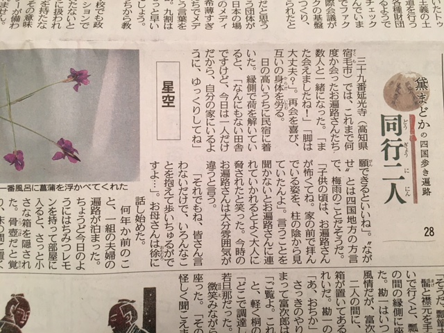東京新聞で始まってる俳人・黛まどかさんの「黛まどかの四国歩き遍路 同行二人」がとてもいい。