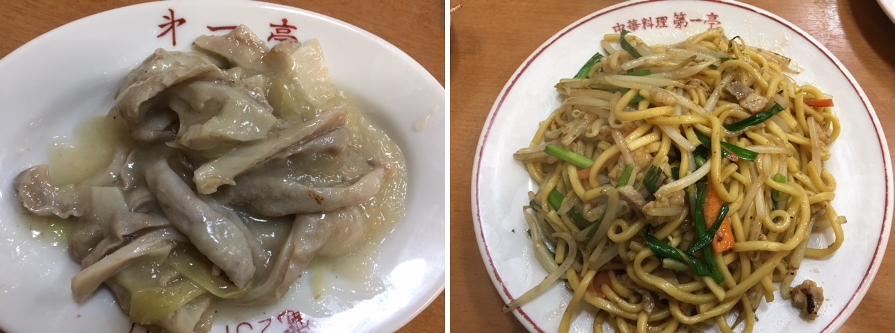 TVや漫画にも登場する日ノ出町の<第一亭>。 もう何を食べても美味しく、本当に楽しくなちゃいますね。 まずは定番チート、豚の胃を生姜で炒め餡をかけたもの。 小さな餃子はルービーに合いますし、炒麺なんぞはつまみです。