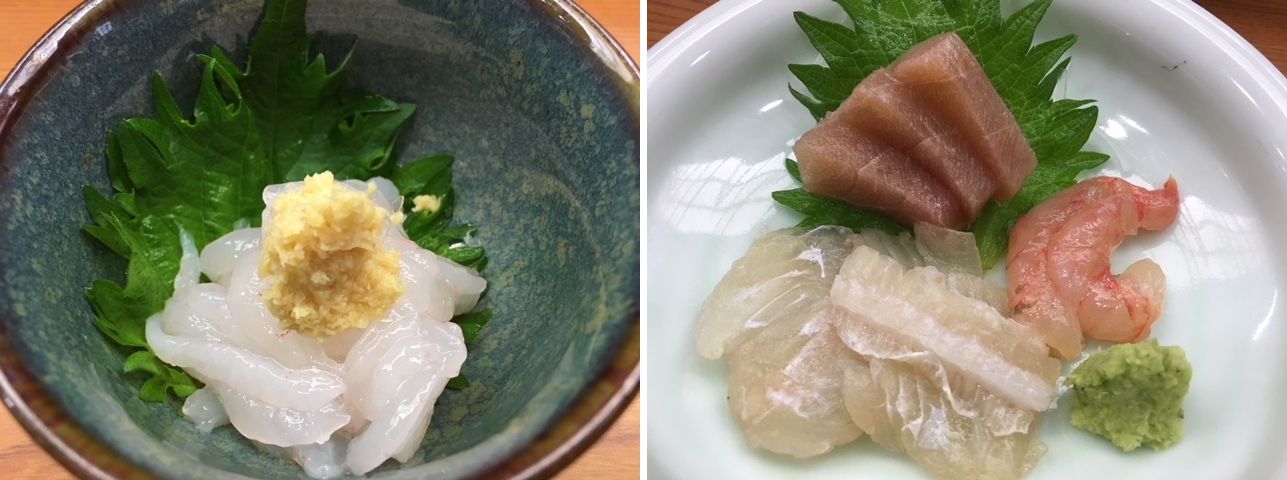 A安易な名物料理 昆布〆ならなんだっていいのか? 薄い昆布を何層にもして締めているが、なんだか安っぽい昆布のにがさだけが出ており、旨み香りなど全くしない。 観光客向けのパフォーマンスか!と言いたいくらい。 ヒラメ・サス(カジキマグロ)・甘エビ。 どれも普通に生で出してくれたほうがよっぽど美味しかったはず。