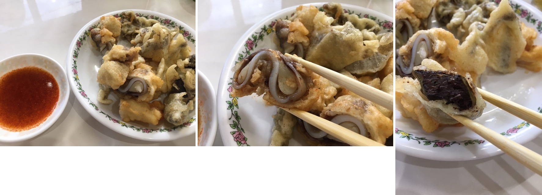 普通の住宅地に突然、何件かの天ぷらの看板。 この<天ぷら>というのが今回のお目当て。 なんとホルモン・豚の内蔵の天ぷらなのです。 下調べしたかぎりでは、この<天ぷら>はメニュウのひとつ、ということではなく、これ自体がメインで、これをみなさん食べに来るそう。