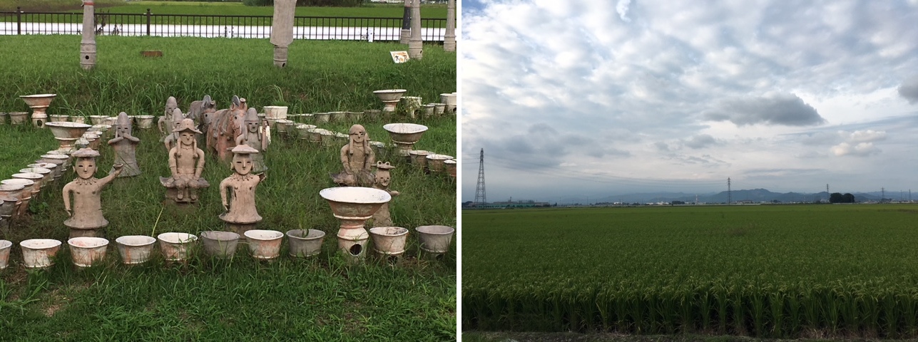 先日の茨城・石岡も国衙があった地でした。 ここ太田も毛野国の大首長を葬ったとされる大型前方後円墳・天神山古墳が威容を誇っています。 まさに古墳だらけなのですが、ポコポコあったであろう円い塚は、今は広々と広がる田んぼと化し、そのド真ん中あたり、ちょっと寂しげに「塚周り古墳群第4号古墳」が復元されていました。 洪水によって埋もれた古墳群なんだそうです。
