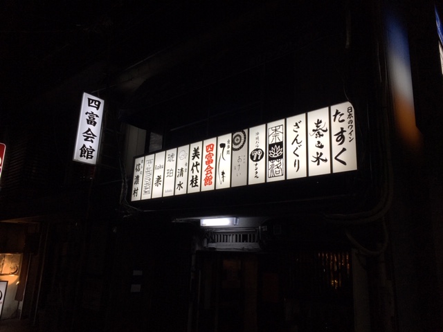 三次会です。 目印が、まっこといかがわしい雰囲気の看板でしたので、新京極の裏路地ポルノ映画館があったりするあたりかな、 と勝手に思っていたのですが、言うならば四条の大丸の並びです「四富会館」。 健全な場所に立つ怪しげな看板。