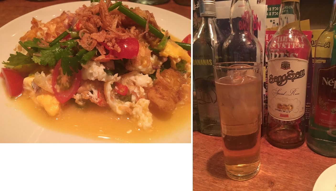 酒はセンソムというタイのラム酒。 これをソーダで割って飲る。 なんといっても玉子好きなので「ヤム・カイダーオ」という半熟目玉焼きのサラダをイッパツめにオーダー。 絶妙な辛味と甘さ。 カウンター内の小さな厨房で作ってくれるのを見ているのも楽しく、 異国情緒がいやが上にも高まってきます。
