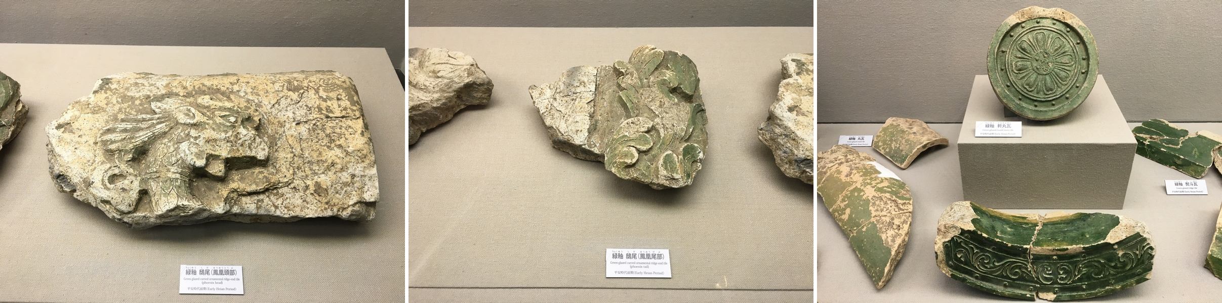 見たかったのは平安京の豊楽殿出土の緑釉鴟尾。 豊楽院は平安宮に設けられた饗宴施設で、その正殿が豊楽殿なのだそう。 たしかにこんなもの見たことない。 鳳凰の彫りの厳しいこと! 毎度のことですが、溜息とともに「カケラでいいからなぁ」と。